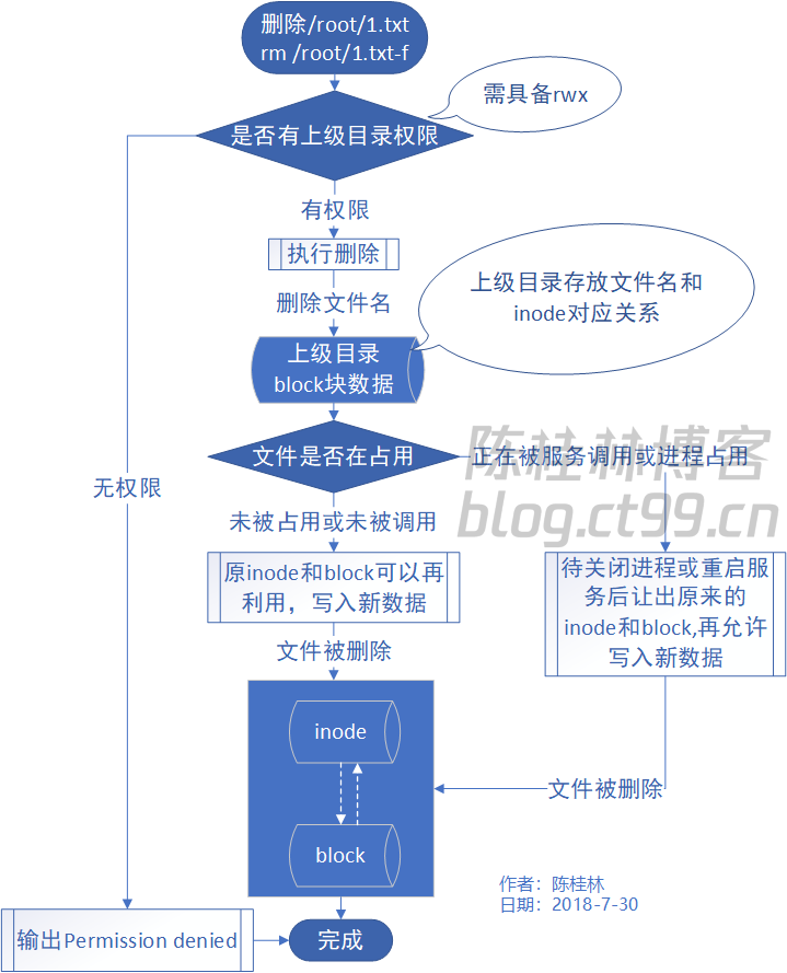 1,先判断删除文件的上级目录是否具有权限,有的话查找inode和文件名的对应关系,通过文件名来确定inode信息(因为我们查找的时候是通过文件名查找的,如果通过inode来找,就是按照inode来找文件名)。