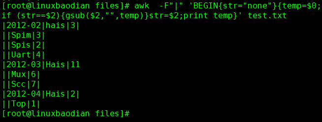 awk -F"|" 'BEGIN{str="none"}{temp=$0;if (str==$2){gsub($2,"",temp)}str=$2;print temp}' test.txt