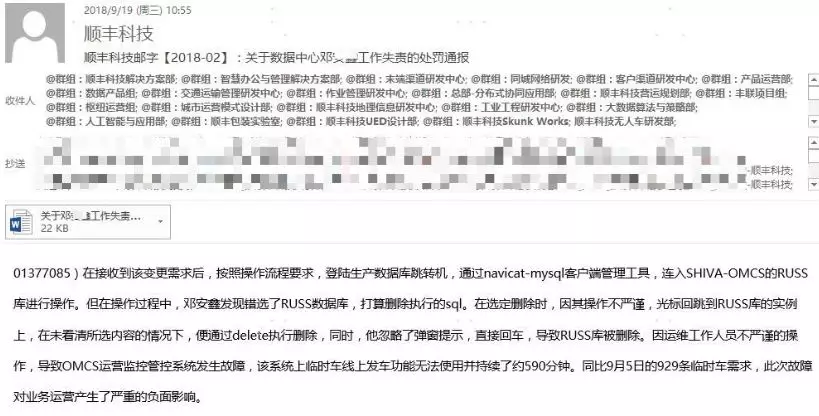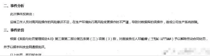 9 月 19 日,微博网友大佬坊间八卦爆料,顺丰科技数据中心的一位高级工程师(邓XX)误删生产数据库,导致某项服务无法使用并持续 590 分钟。顺丰根据公司相关规定,辞退工程师邓某,并在顺丰内网通报。