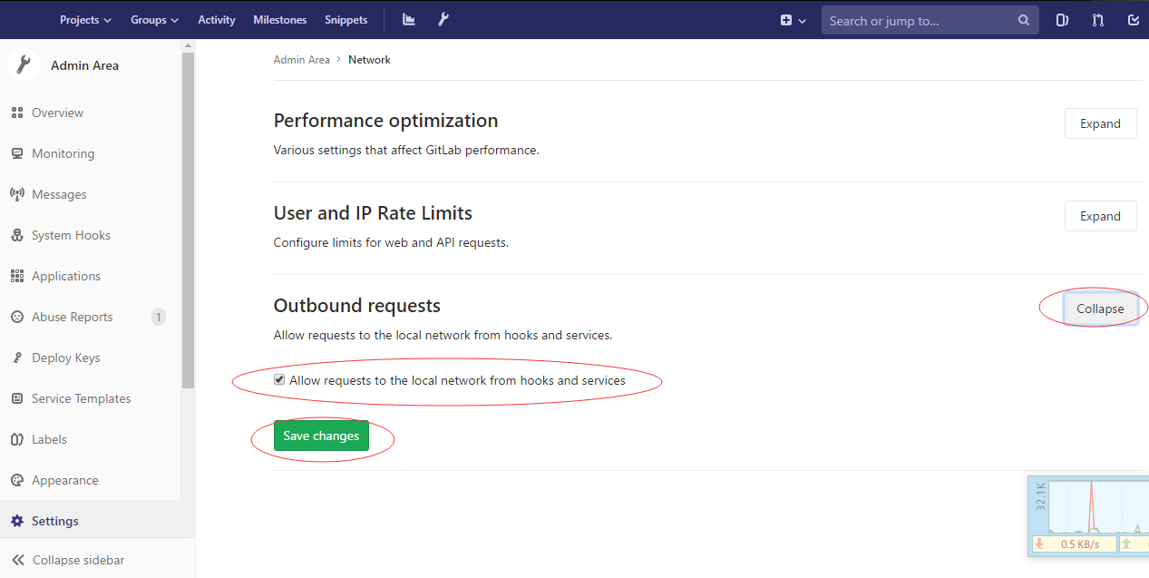 大致意思 gitlab 10.6 版本以后为了安全,不允许向本地网络发送webhook请求,如果想向本地网络发送webhook请求,则需要使用管理员帐号登录,默认管理员帐号是root,密码就是你gitlab搭建好之后第一次输入的密码,登录之后,进入Admin area,在Admin area中,在settings标签下面点击network,找到OutBound Request,勾选上Allow requests to the local network from hooks and services,保存更改即可解决问题,如下图所示
