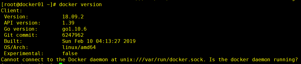 由于docker也是C/S结构,所以这里我们看到一句报错,意思是无法通过SOCK文件连接服务端。这里仅仅是查看了docker client版本