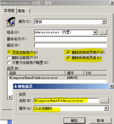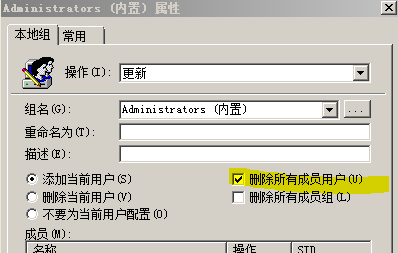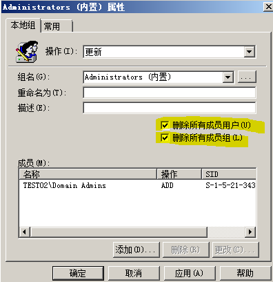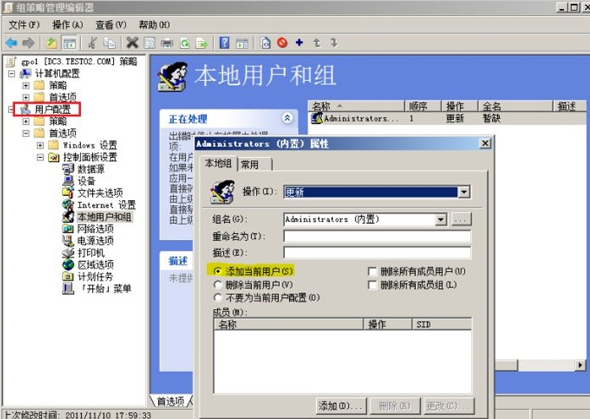 操作中的”更新”代表更新域客户端Administrators组中的成员,”添加当前用户”是指添加登录时的域帐号到客户端本地Administrators组,只要域帐号一登录,就把它加入本地管理员组