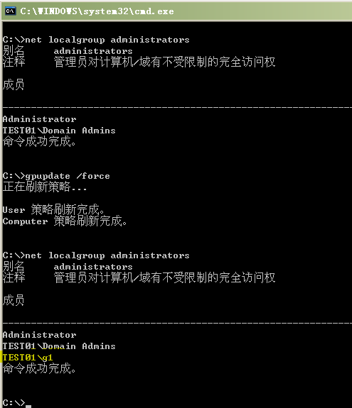 .刷新域客户机的组策略,就可以看到test01\g1组被自动加入到本地管理员组了,如下图