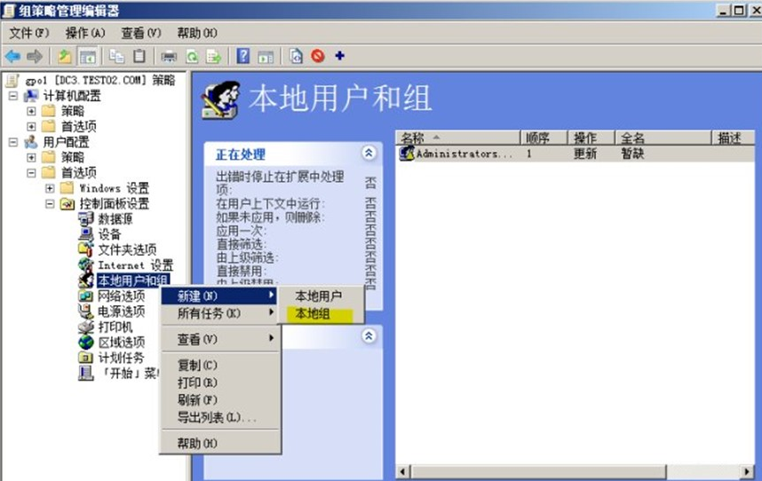 2、对于WIN2008/2008R2(尽可能用R2的DC)的DC环境,使用用户配置首选项中”本地用户和组”.用在将登录帐号自动加入本地管理员组的场合。