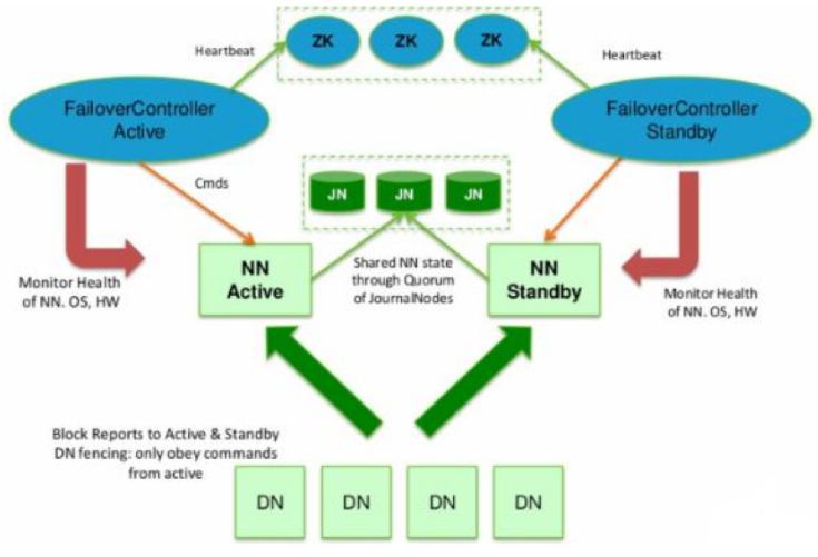 为了保证Active NN与Standby NN节点状态同步,即元数据保持一致。除了DataNode需要向两个NN发送block位置信息外,还构建了一组独立的守护进程”JournalNodes”,用来同步FsEdits信息。当Active NN执行任何有关命名空间的修改,它需要持久化到一半以上的JournalNodes上。而Standby NN负责观察JNs的变化,读取从Active NN发送过来的FsEdits信息,并更新自己内部的命名空间。一旦ActiveNN遇到错误,Standby NN需要保证从JNs中读出了全部的FsEdits,然后切换成Active状态。