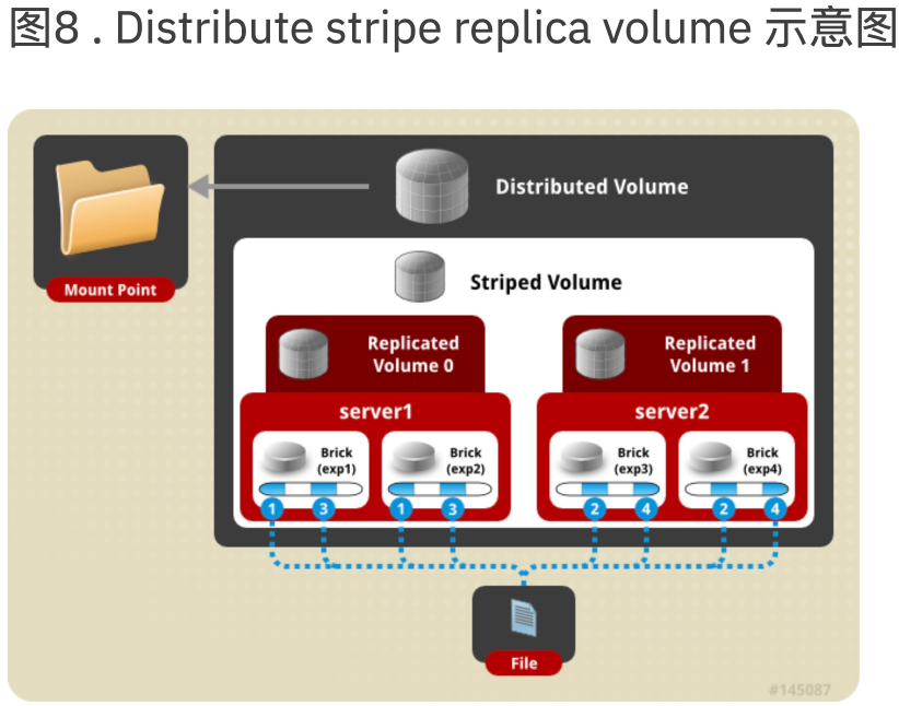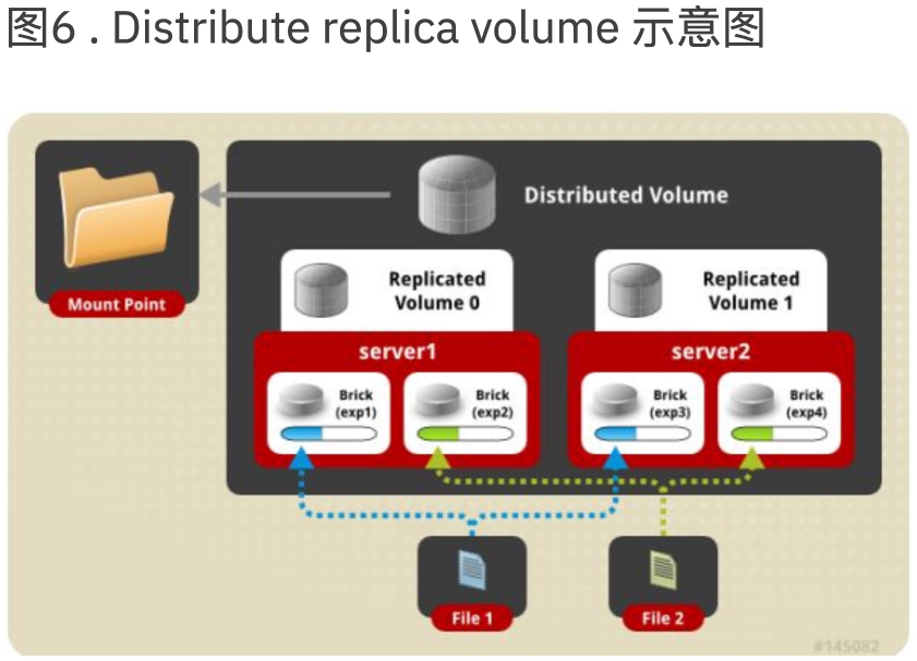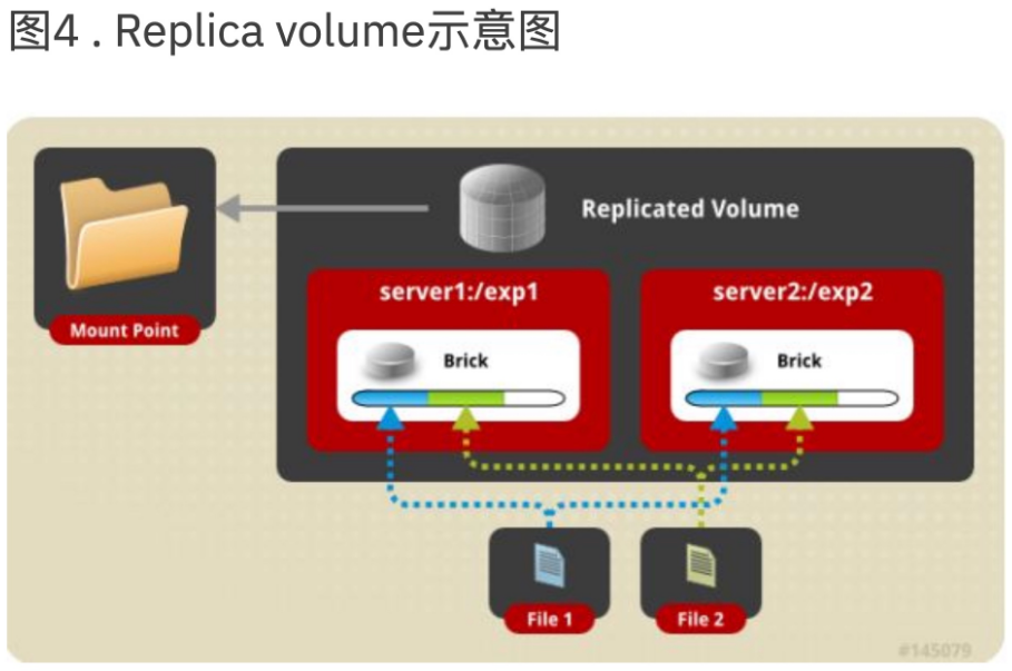 类似于Raid1,文件同步的复制到多个brick上,具有容错能力,写性能下降,读性能提升(待测),Replicated模式,也称作AFR(Auto File Replicated),同一个文件在多个镜像存储节点上保存多份,每个节点上都具有想用的目录结构和文件.replica volume是容器存储中较为推崇的一种.