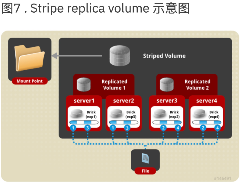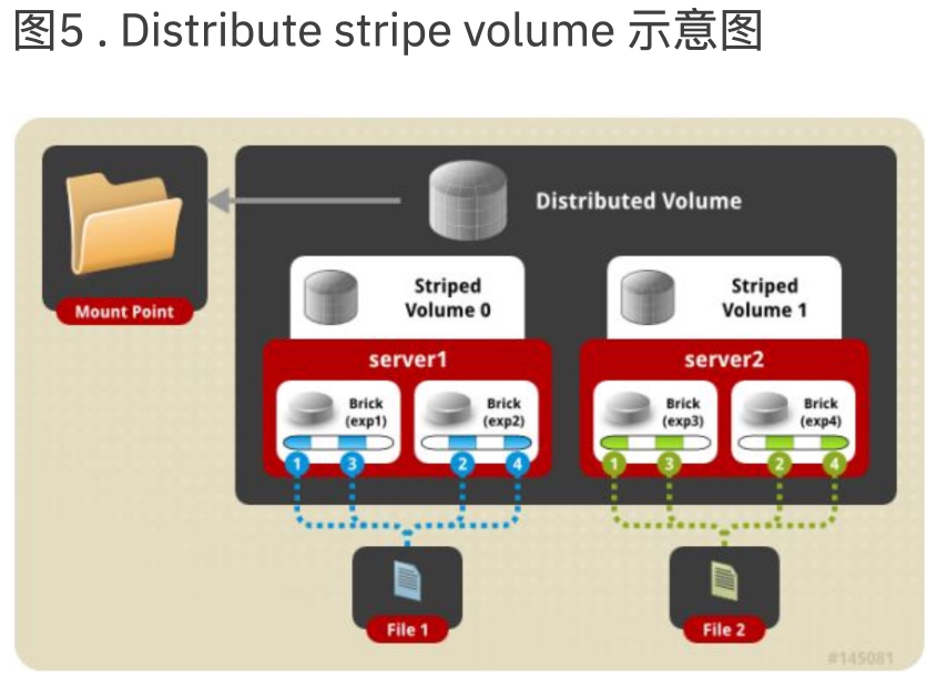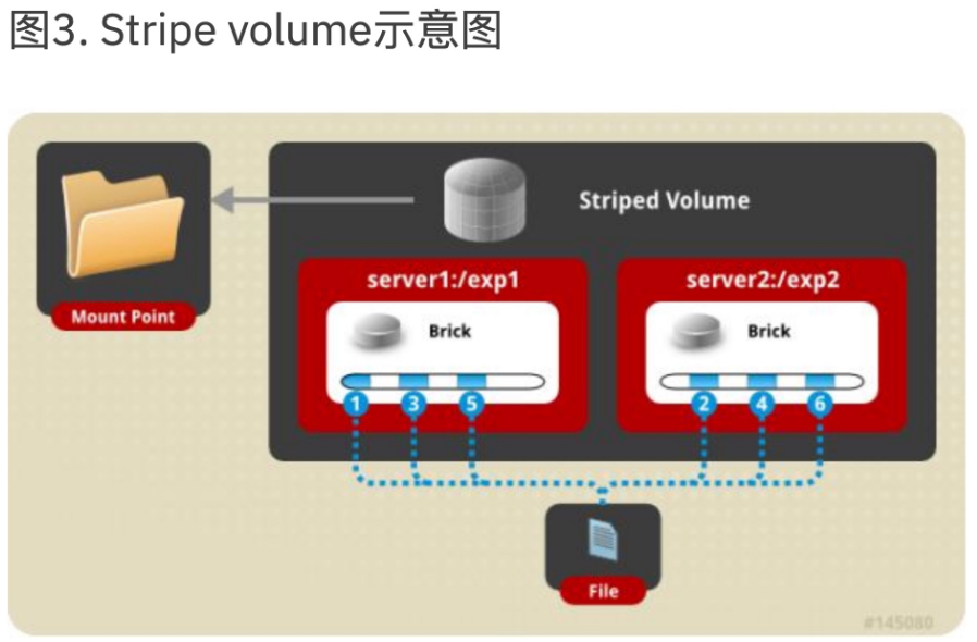 类似Raid 0,文件分成数据块以Round Robin(循环)方式分布到brick server上,并发粒度是数据块,支持超大文件,大文件的读写性能高(因为他是分块存储,可以同时多个磁盘写入)