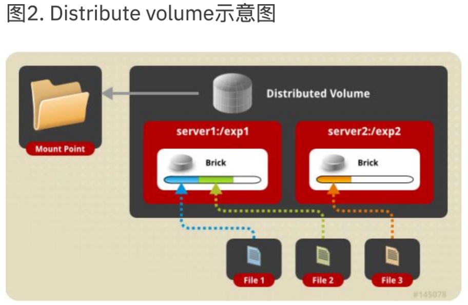 基于Hash算法将文件分布到所有的brick server上,只是单纯的扩大了磁盘空间,不具备冗余能力,数据丢了就丢了,由于distribute volume使用本地文件系统,因此存取效率并没有提高,相反会应为中间又加上了一层网络传输,效率反而降低了.另外本地存储设备的容量有限制,因此支持超大型文件会有一定的难度