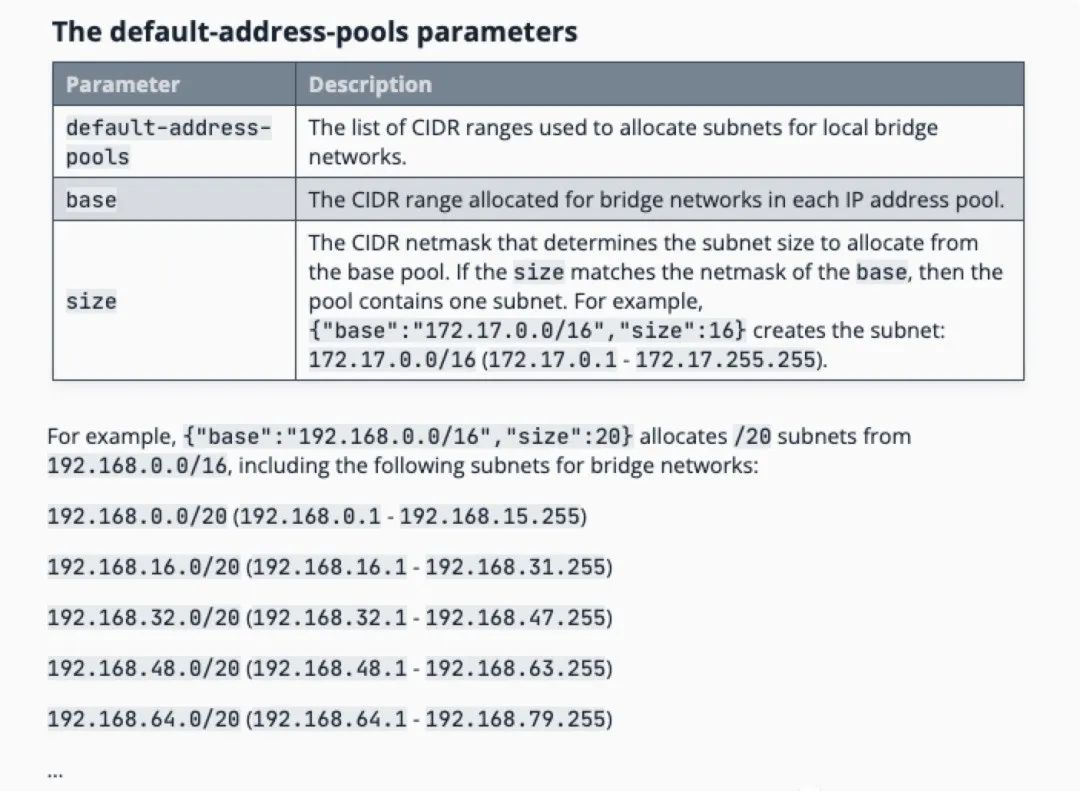 其中,base 告诉我们划分子网的网段是什么(从来开始),是从前两位(/16)开始,还是第三位开始(/24)呢?而 size 则告诉我们划分的每个子网有多少 IP 地址可以使用呢?从 "10.210.200.0/24" 我们可以知道,该网络下面只有 254 个可用的 IP 地址(直接使用肯定不够),然后我们需要给 docker 使用,划分每个子网可用 16 个 IP 地址,所以子网就应该写成 28 了。