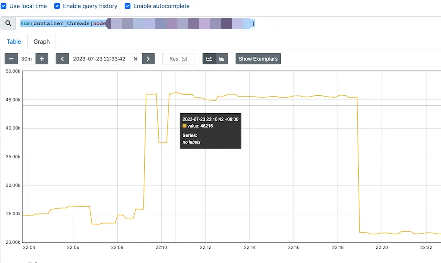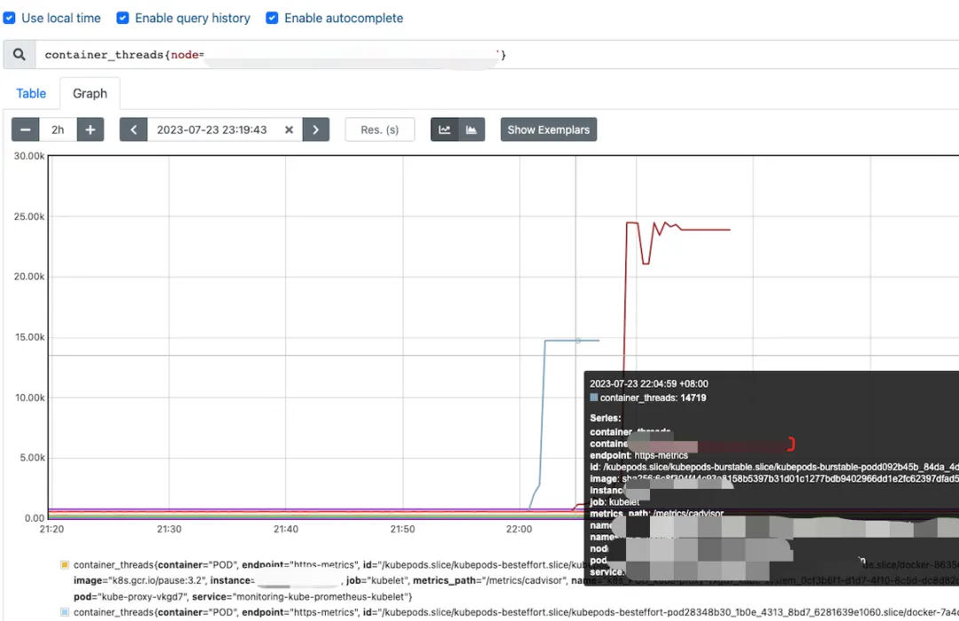 等等,还没完,到底是谁把 PID 耗尽了呢,还要找出真凶,容器总线程 突增,说明是某个容器造成的,安排promql 查,container_threads{node="node-xx"}
